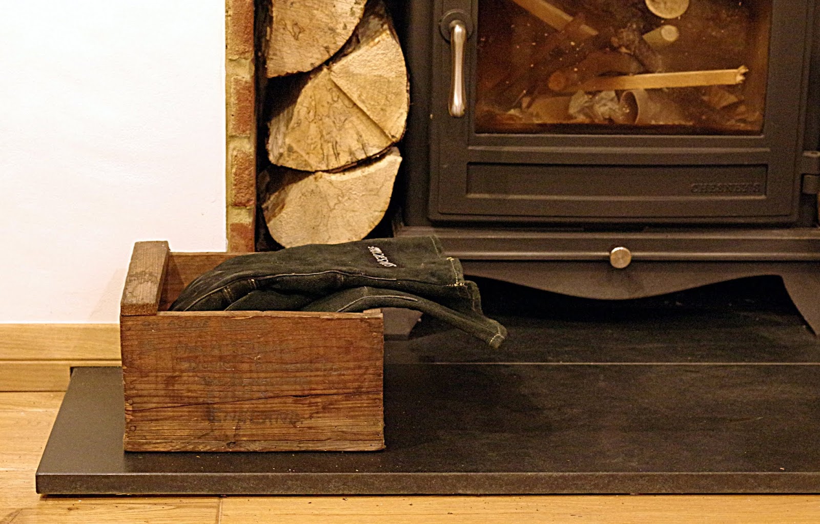 Whatever its real history, this old box has now been promoted, moving from our garage to a cosy warm location beside our wood-burning stove, where it holds a gas lighter, a pack of paraffin fire lighters, and a pair of Chesney's stove gloves.