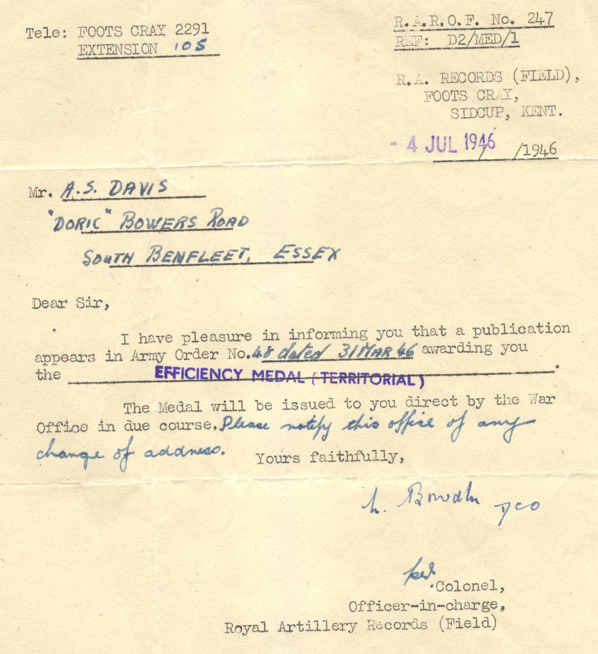 The Efficiency Medal (Territorial) was apparently awarded to my dad for military service of at least 12 years. Since each year of the war (1939-1945) counted as 2 years, his service period from 1938 to 1946 was long enough for him to qualify.